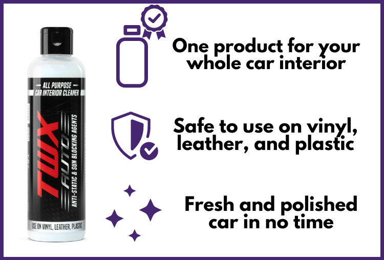 TWX® Auto Interior je jedan proizvod koji čisti, zaštićuje i dezinficira praktično svaku površinu unutar automobila! Moćni sastojci proizvoda će ubiti viruse i bakterije te će momentalno dezinficirati i očistiti bilo koju površinu! Jednostavno ga nanesite i obrišite za profesionalne rezultate čišćenja svugdje, od upravljačke ploče do oplata vrata pa i više!
