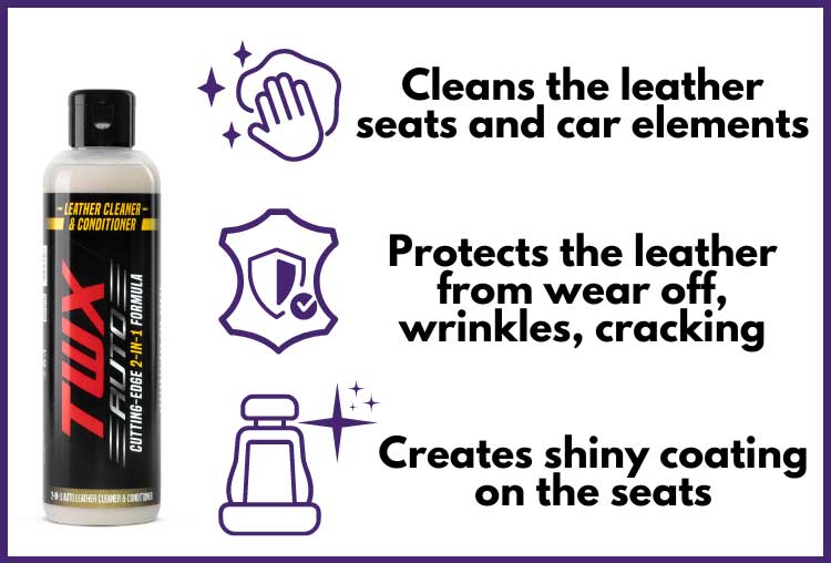 TWX® Auto Leather čini vaše kožne površine svilenkasto glatkim na dodir bez da ih čini vlažnim i ljepljivim. Njegova formula je napravljena kako bi bio efikasan i kao čistač ali i za njegu. TWX® Auto Leather prodire duboko u kožu, održava je i njeguje te ostavlja prijatan, nenapadan miris svježine. Naš proizvod zadržava izgled i zaštićuje kožu unutrašnjosti auta od pucanja i izblijeđivanja i pruža joj dugotrajnu i pravilnu njegu. TWX® Auto Leather Sredstvo za čišćenje i njegu kože - 2-u-1 formula koja vam omogućava da čistite, polirate i regenerirate sve kožne dijelove u jednom svrsishodnom koraku.